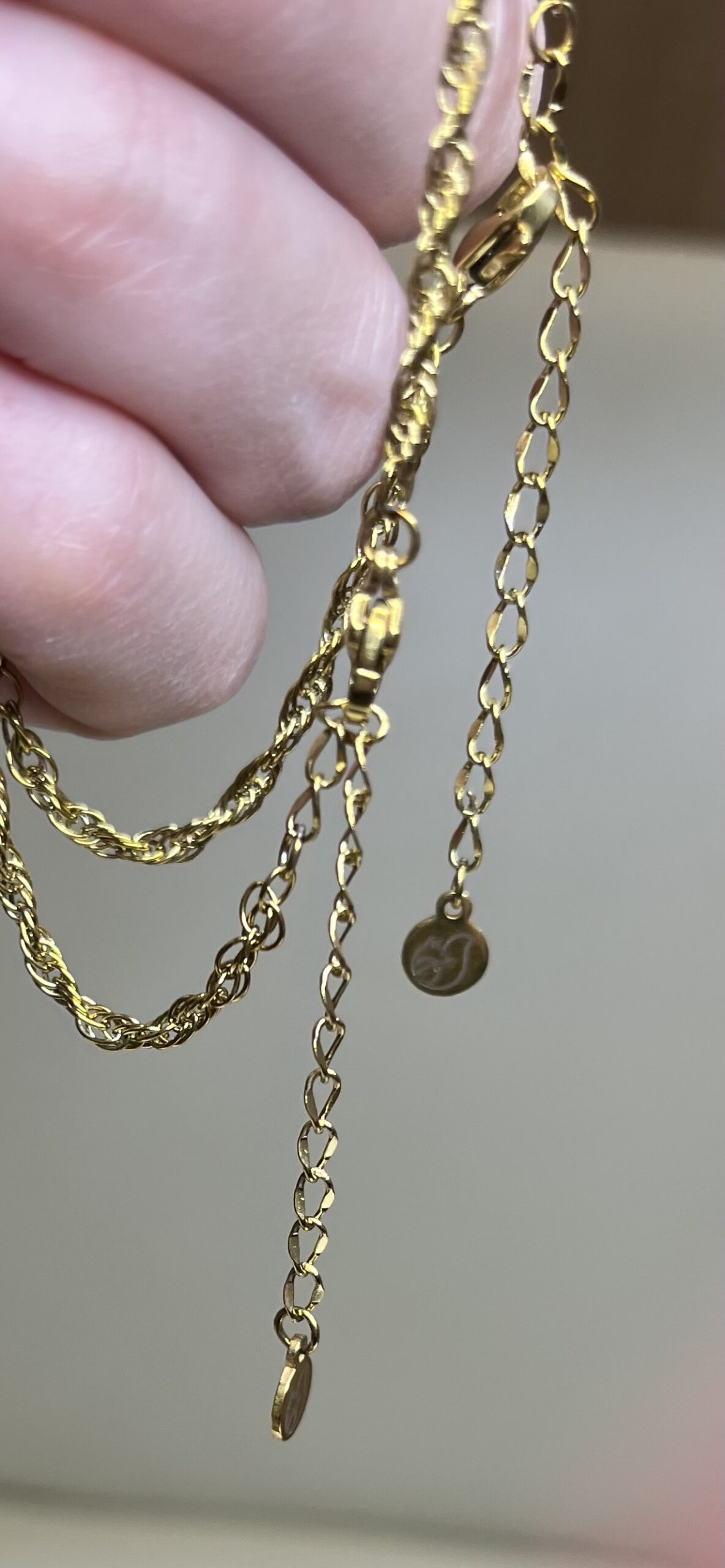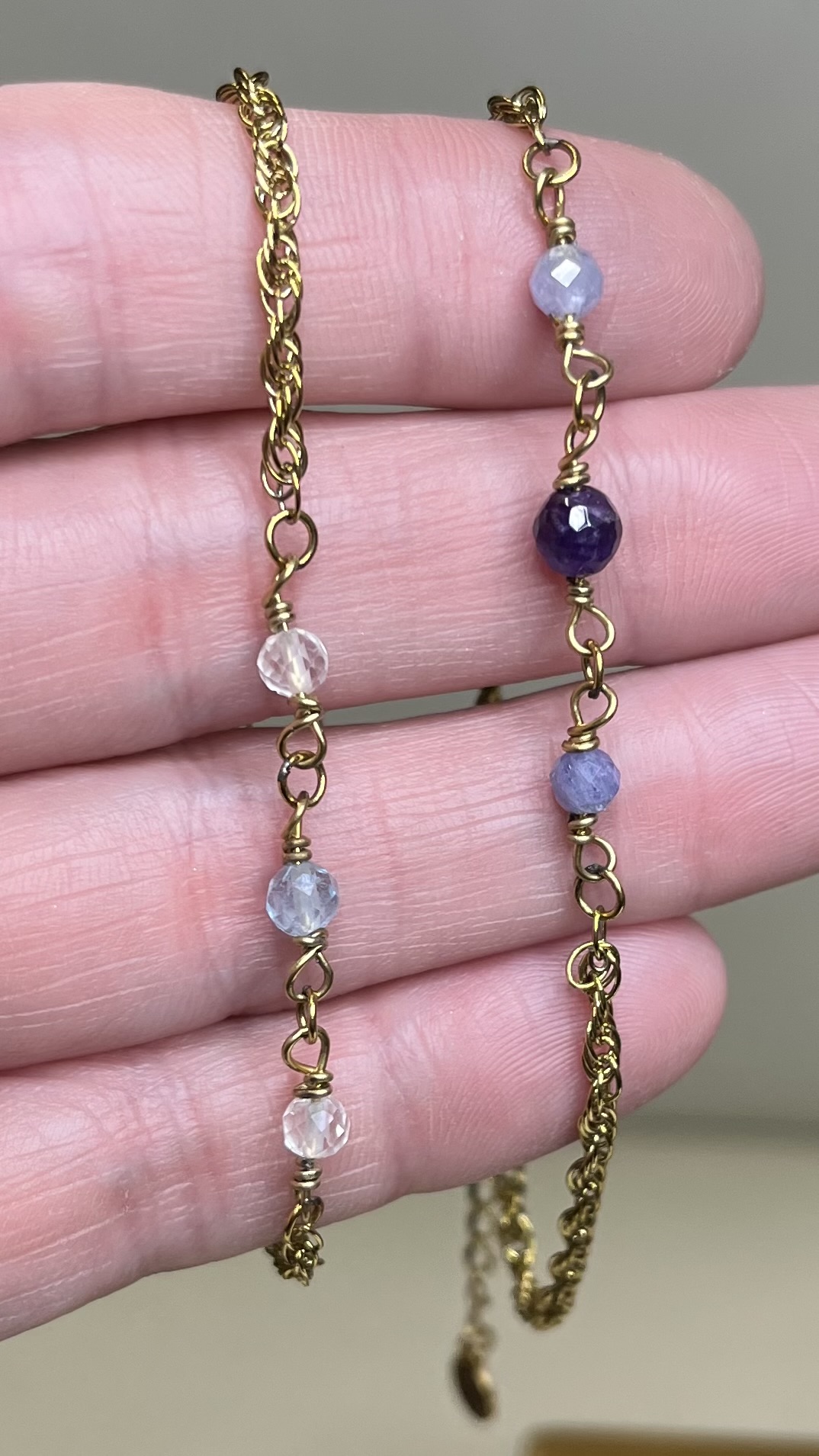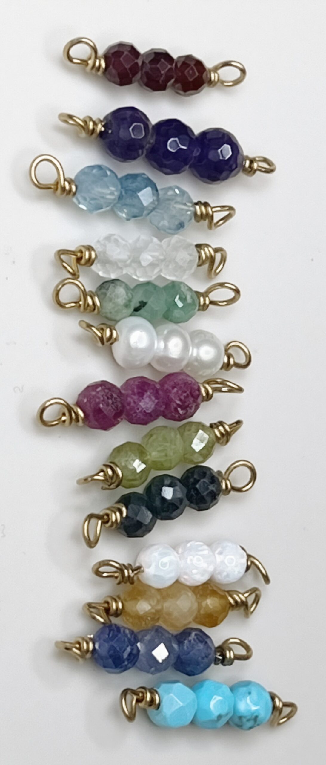 Choose from silver tone or ion-plated gold tone rope chain. Price includes ~6.5″ bracelet with a 4-5″ extender, and up to 3 handmade single birthstone connectors (3 bead connectors shown only to display available stones). Up to 3 additional birthstones available at additional charge. Please let us know in the checkout notes if you’d like your stones arranged in a specific order!